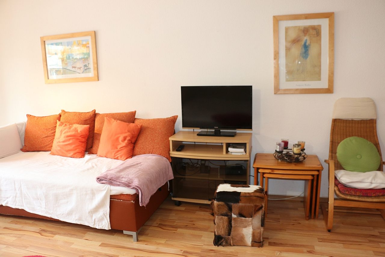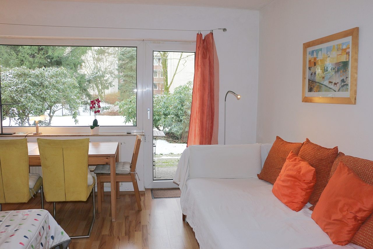 Modern furniture, laminated floor, kitchenette with microwave, bathroom with tube, cable TV, flatscreen with integrated WiFi router, internet, telephone, Washing machine in the basement