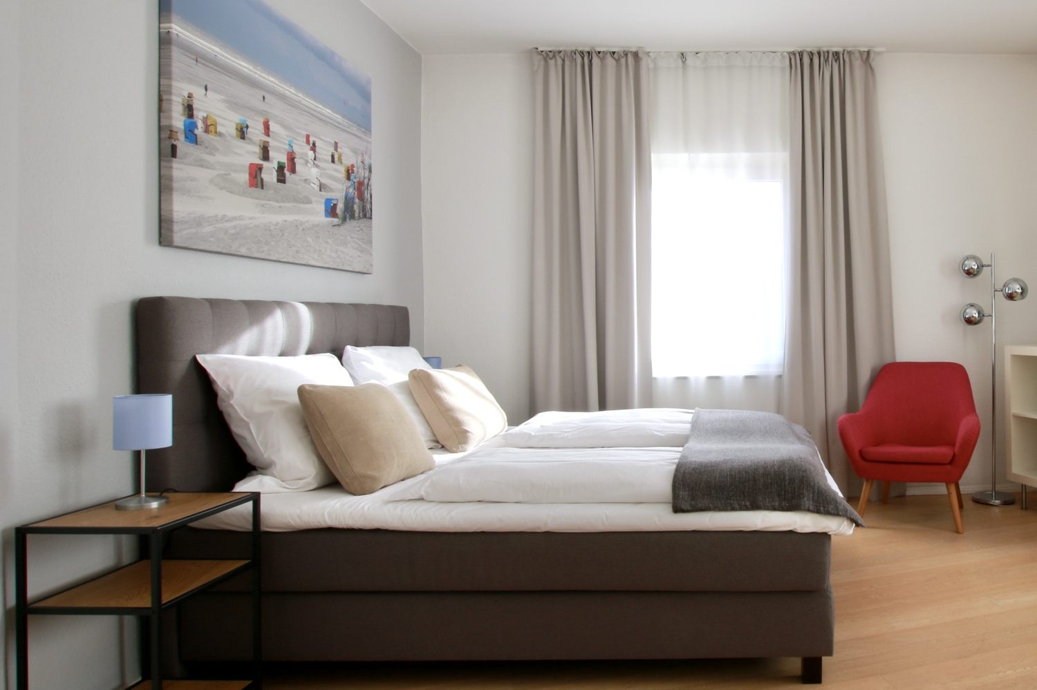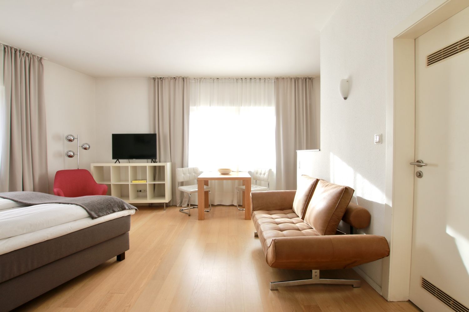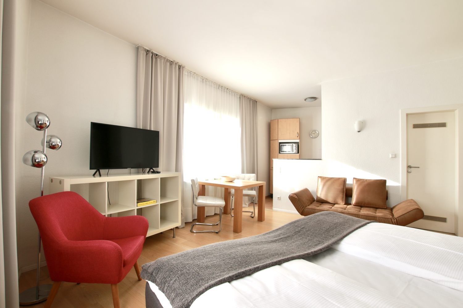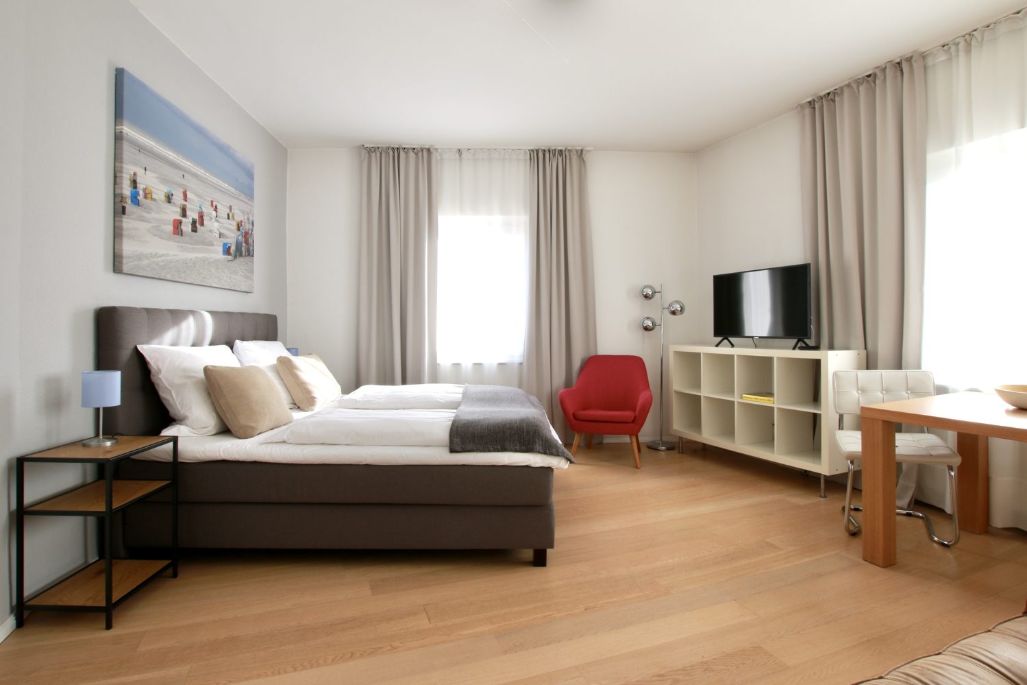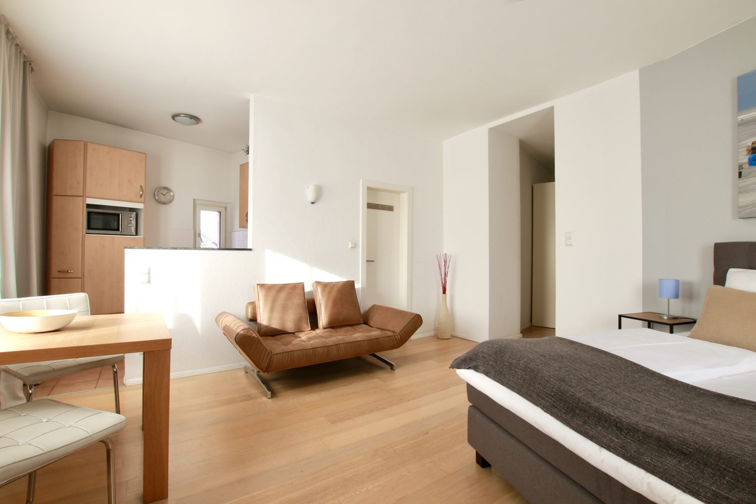 living/ bedroom with double bed 1,60m, change of bed linen and cleaning service on request at an extra charge, incl. free WiFi internet access, pets by arrangement, minimum term of lease 3 months