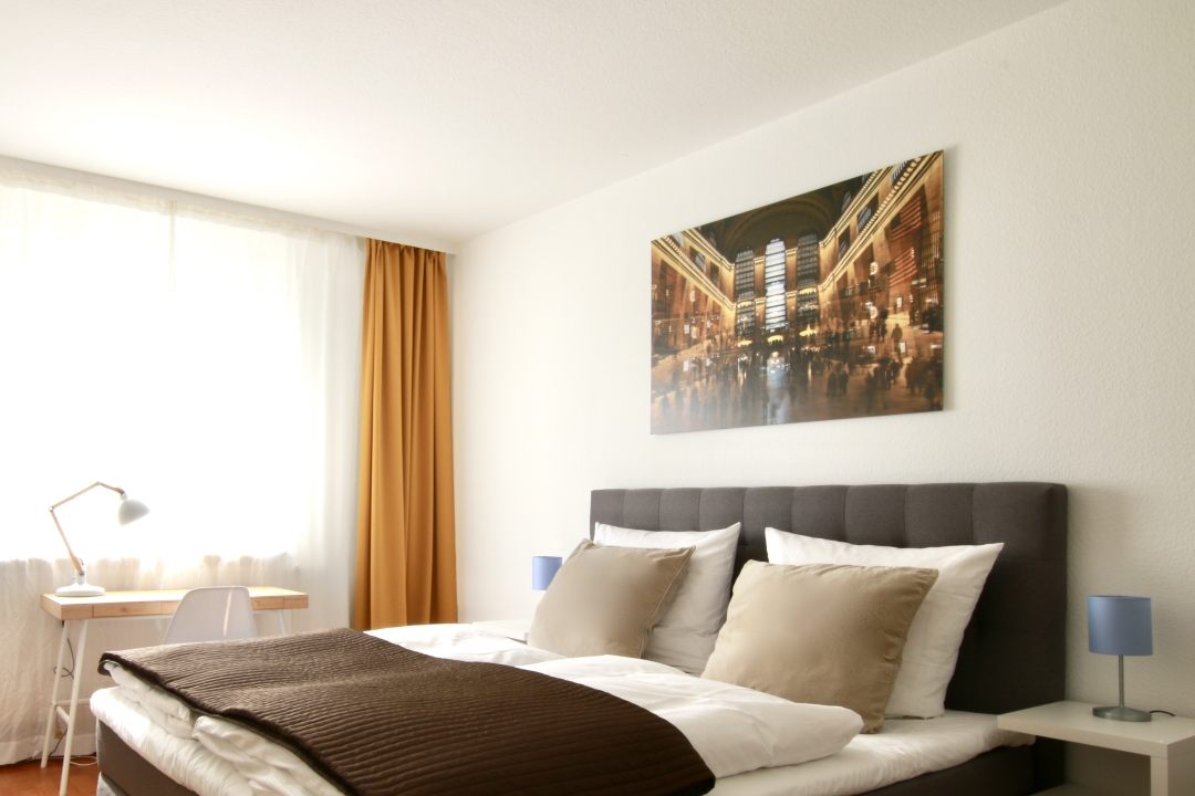 Balcony, bedroom with queen size bed 1.40 m, incl. WiFi internet connection, change of bed linen and cleaning service on request at an extra charge, minimum term of lease 2 months, shorter rental period on request, plus final cleaning 180,00 €