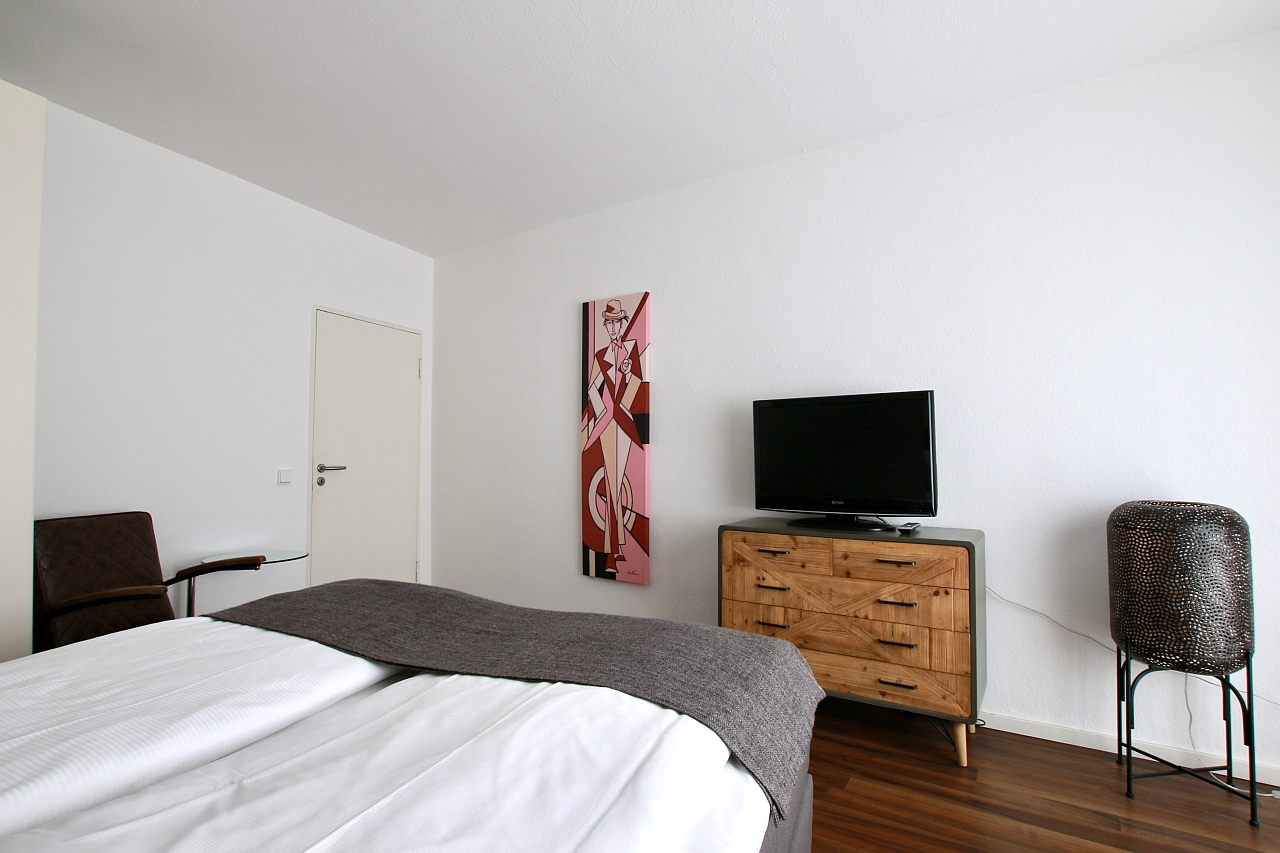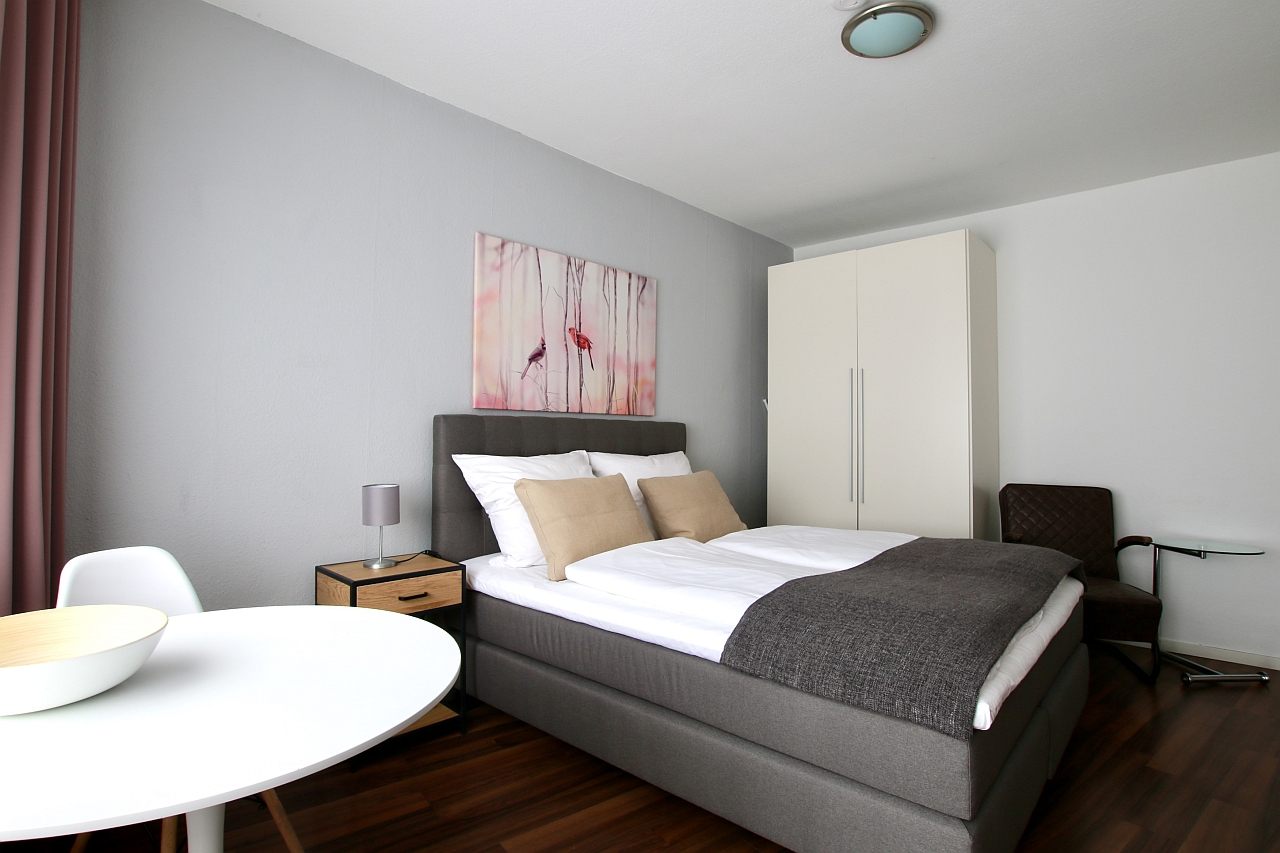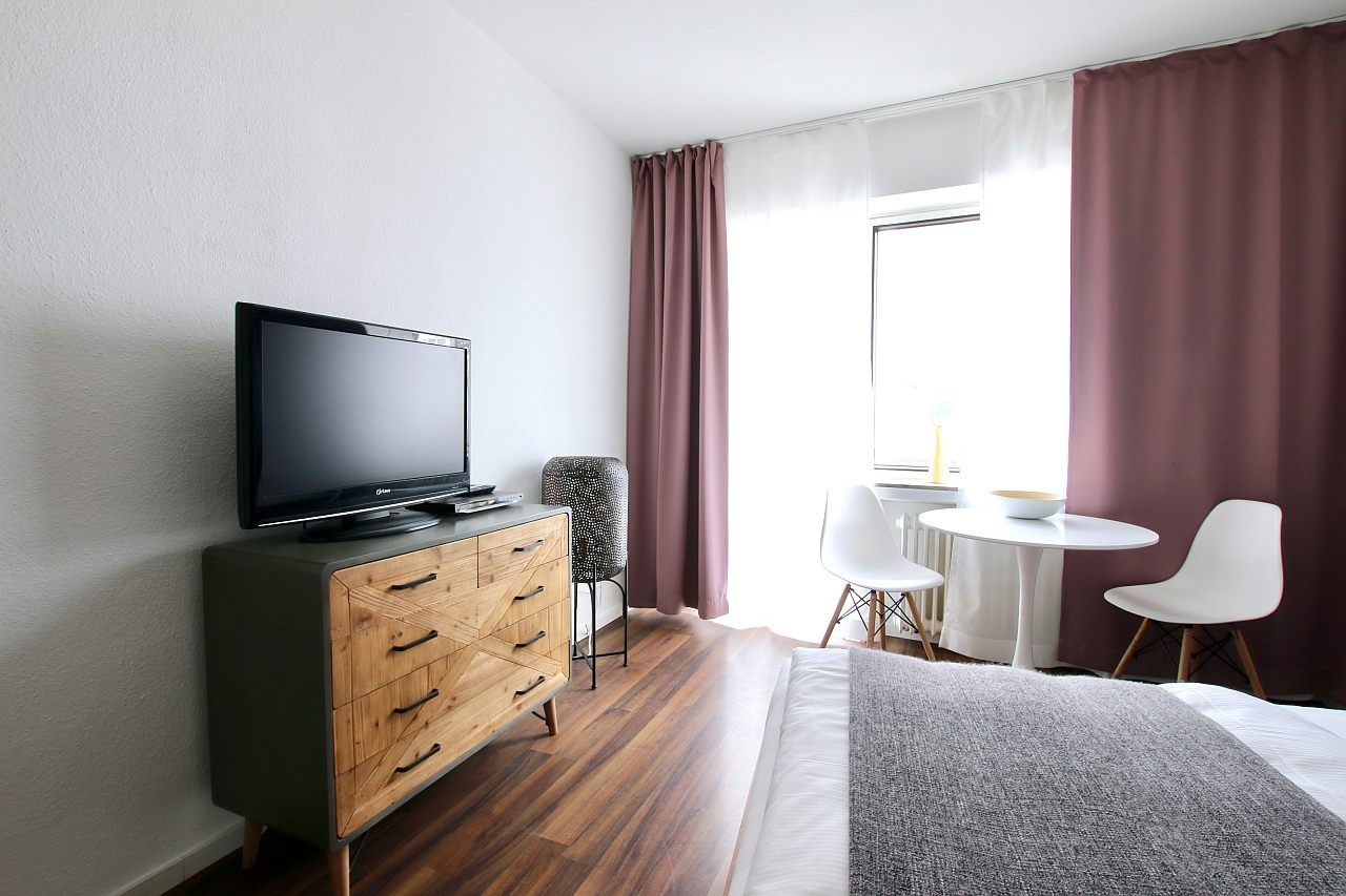 Balcony, living room / bedroom with double bed 1.60 m, bed linen and cleaning service optionally, laundry room in the basement, pets not allowed, DSL WiFi optionally for 8.00 Euros/week, minimum term of lease 2 months, plus final cleaning 180,00 €