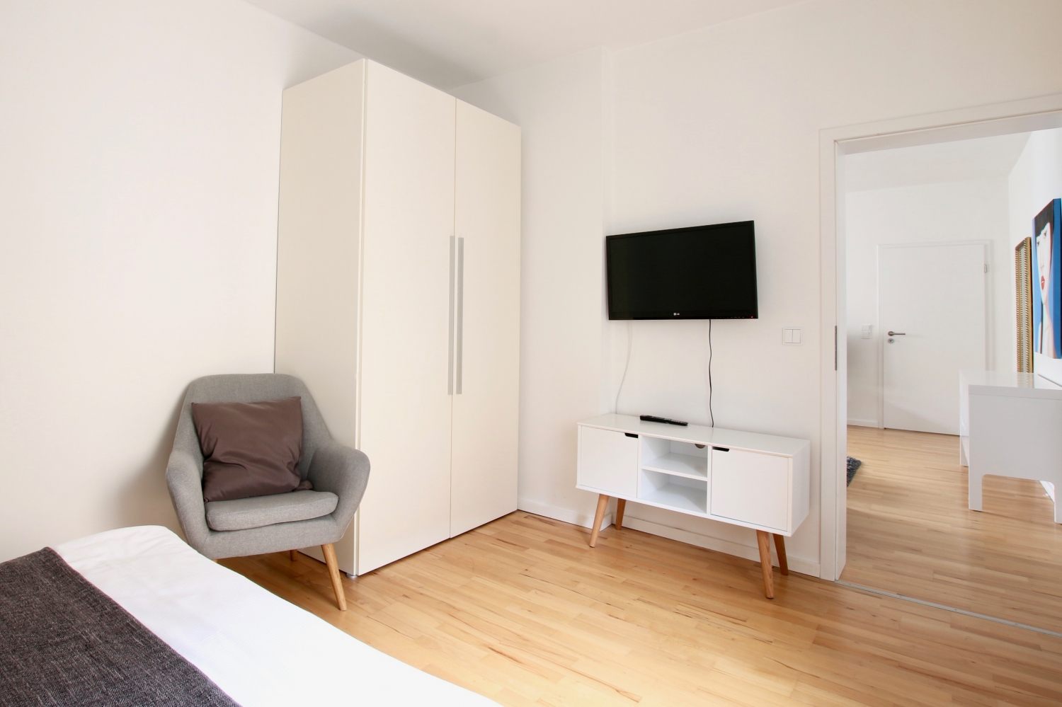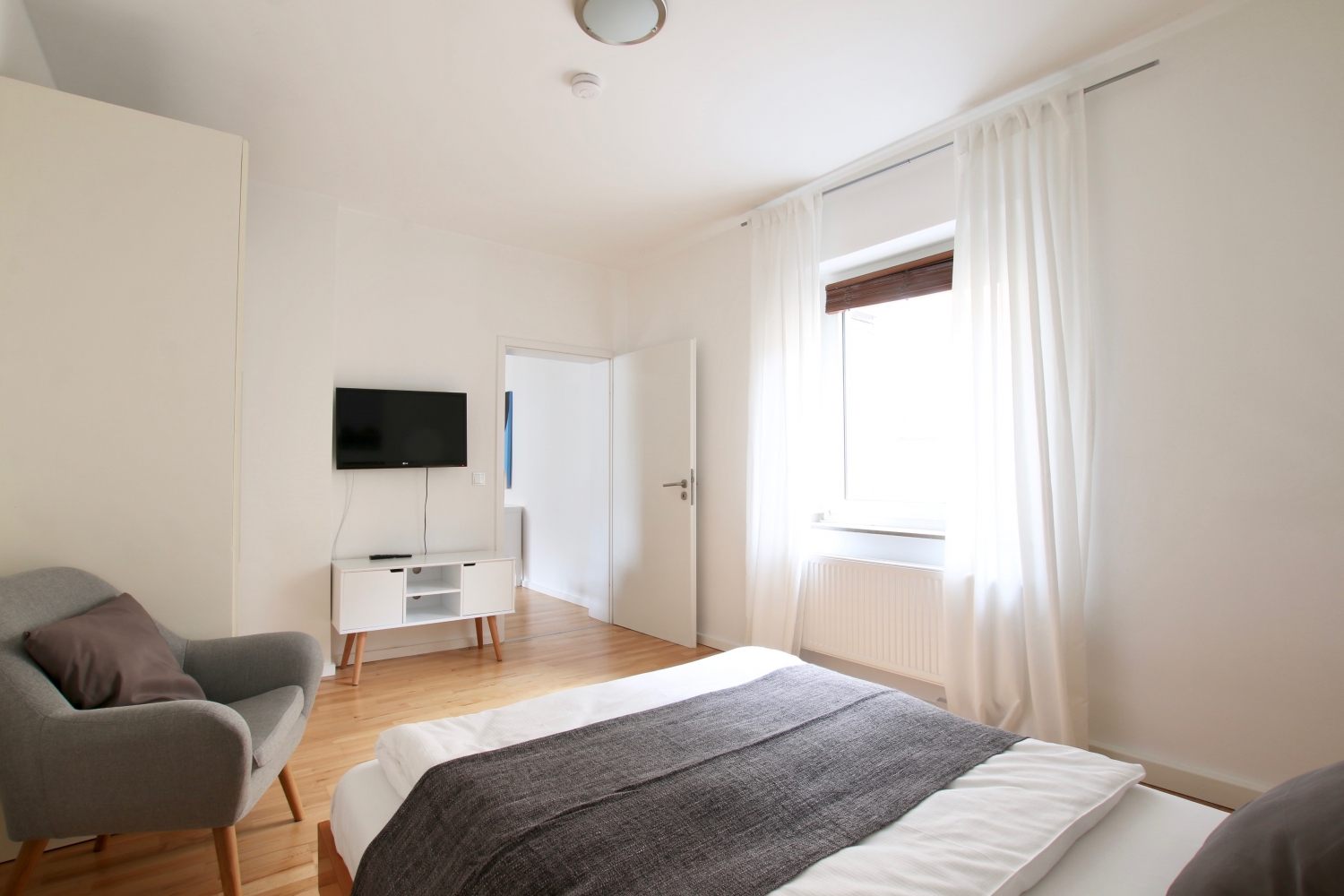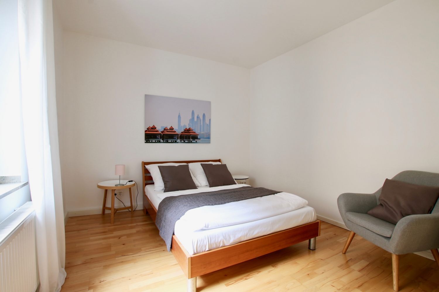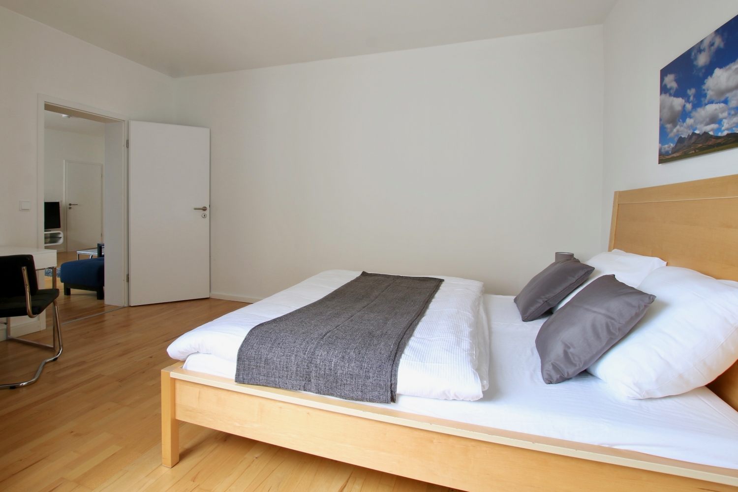 Balcony, living room, 1st bedroom with double bed 1.60 m, 2nd bedroom with queen-sized bed 1.40 m, bed linen and towels available, pets not allowed, smoking only on the balcony, WiFi optionally for 8.00 EUR/week, cleaning and laundry service optionally for a surcharge, minimum term of lease 6 months, plus final cleaning 320,00 €