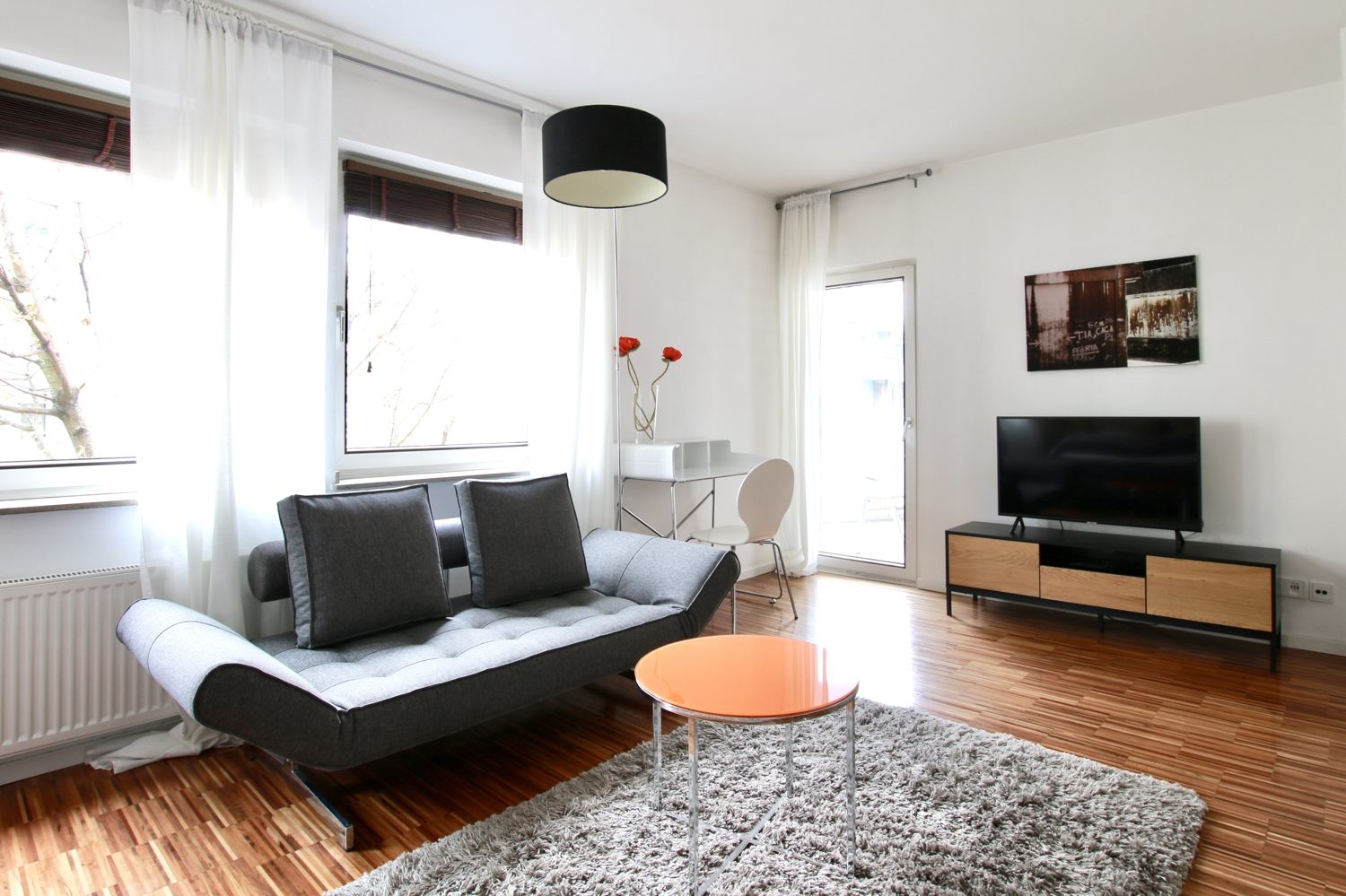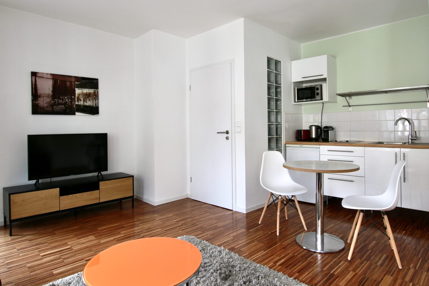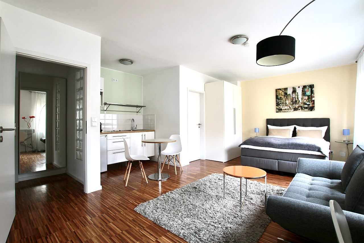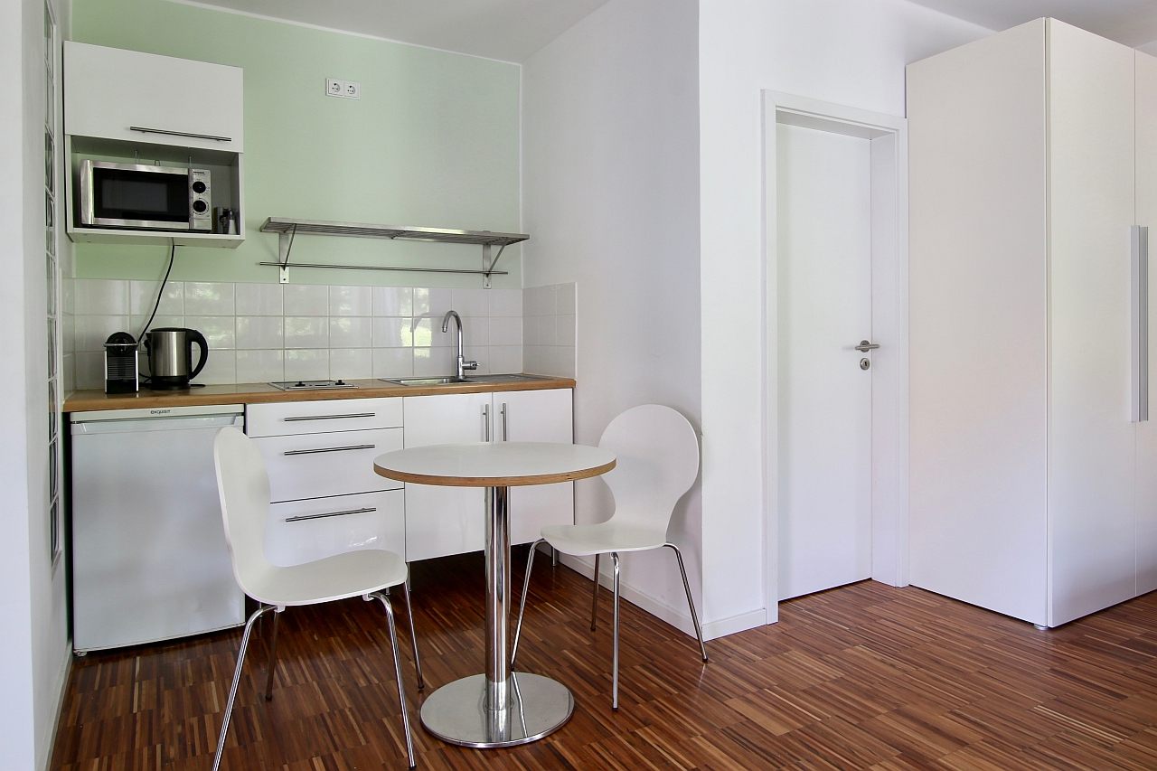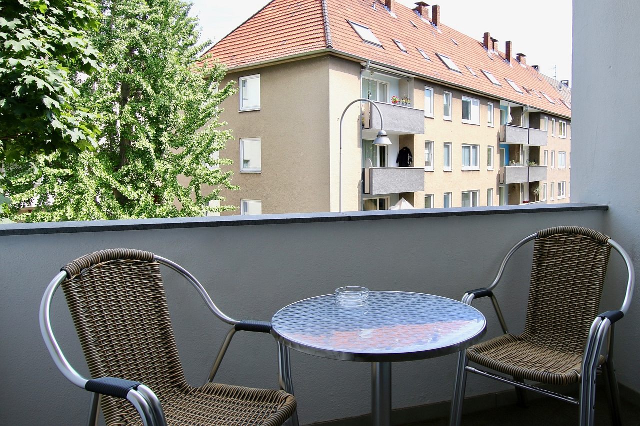 Balcony, living room / bedroom with double bed 1.60 m, bed linen and cleaning service optionally against a surcharge, internet optionally against a surcharge, minimum term of lease 2 months, shorter rental period on request, plus final cleaning 180,00 €