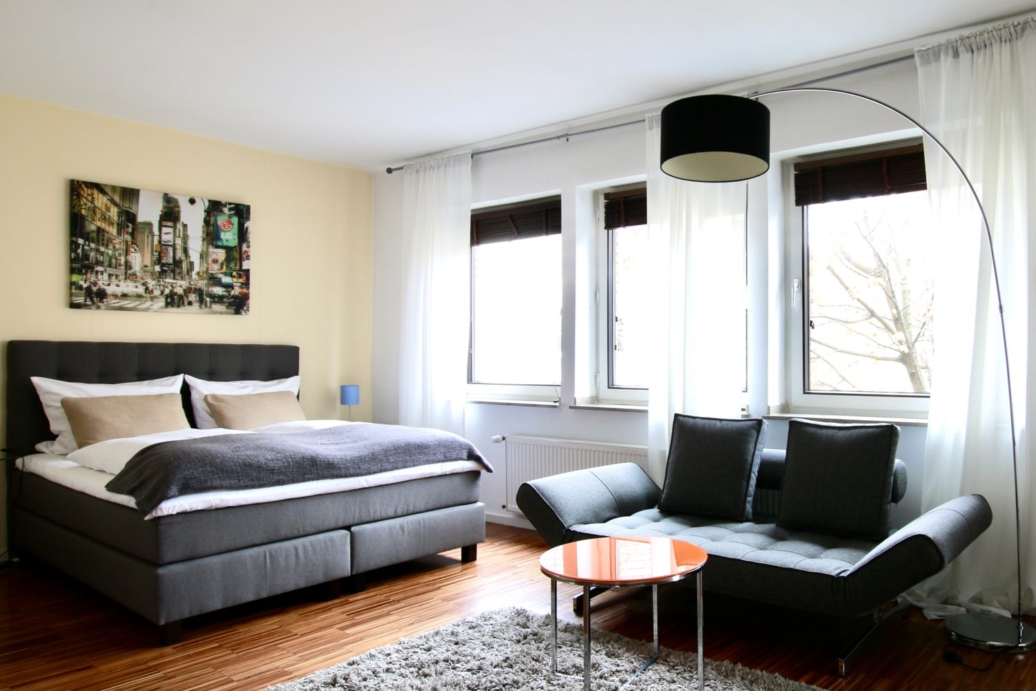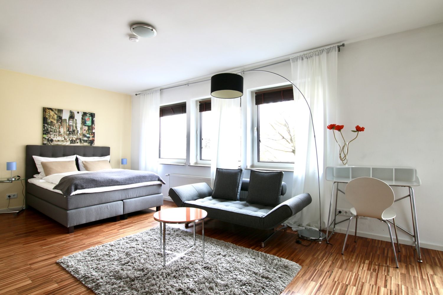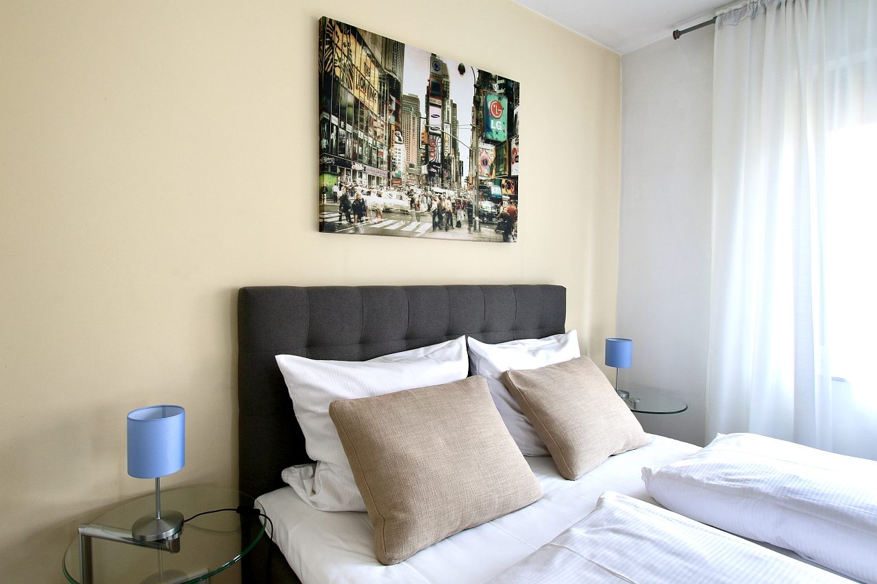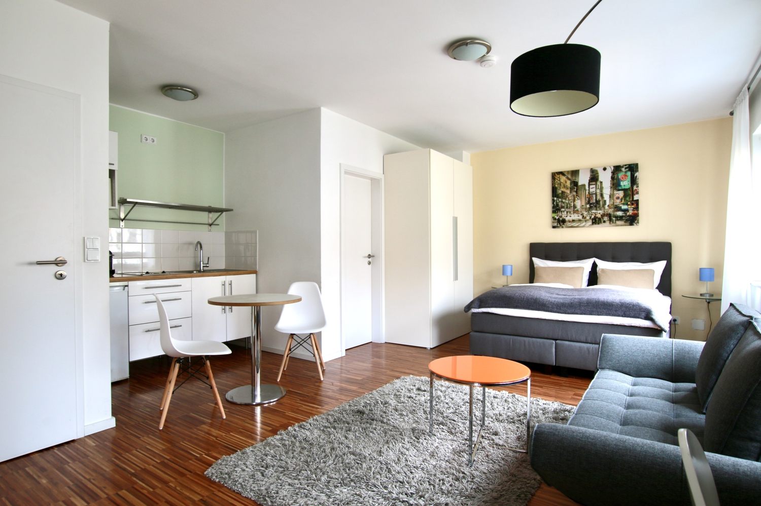 Balcony, living room / bedroom with double bed 1.60 m, bed linen and cleaning service optionally against a surcharge, internet optionally against a surcharge, minimum term of lease 2 months, shorter rental period on request, plus final cleaning 180,00 €