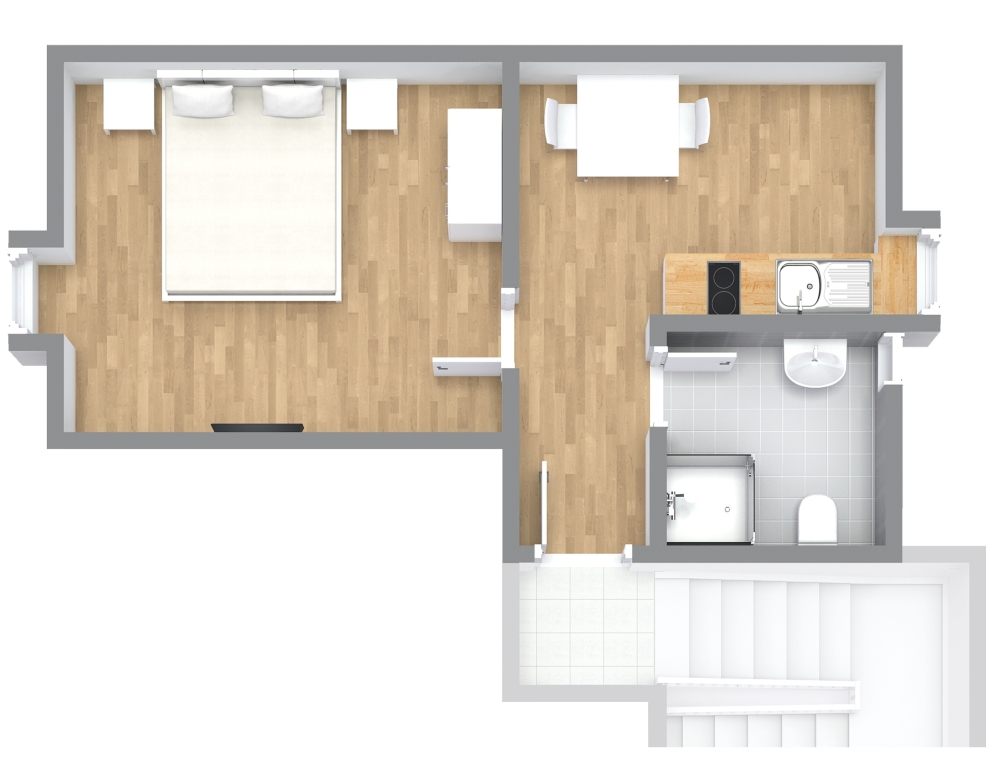 Modern furniture, parquet floor, kitchenette with a stove, bathroom with shower, flatscreen table tv, WiFi internet connection optional