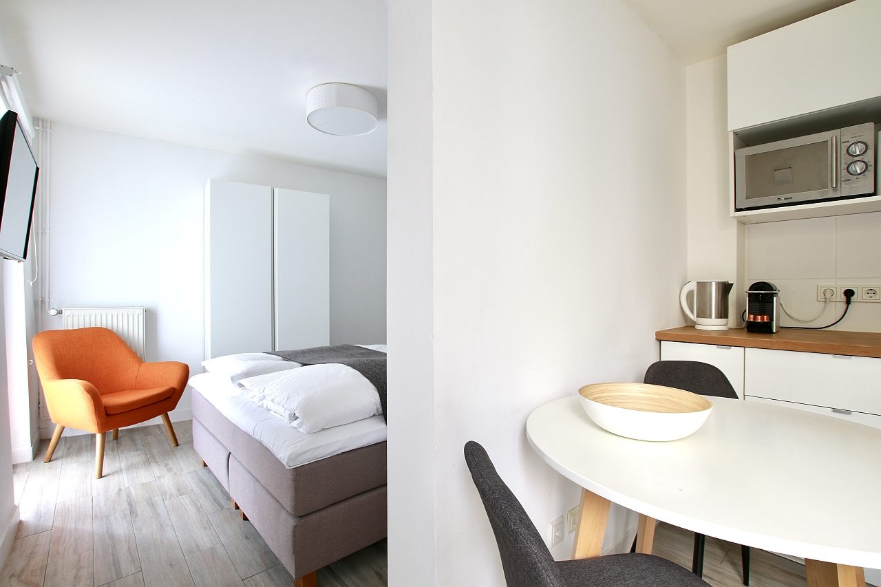 Tasteful furniture, wooden floor, fully equipped integrated kitchenette with a microwave, bathroom with shower,