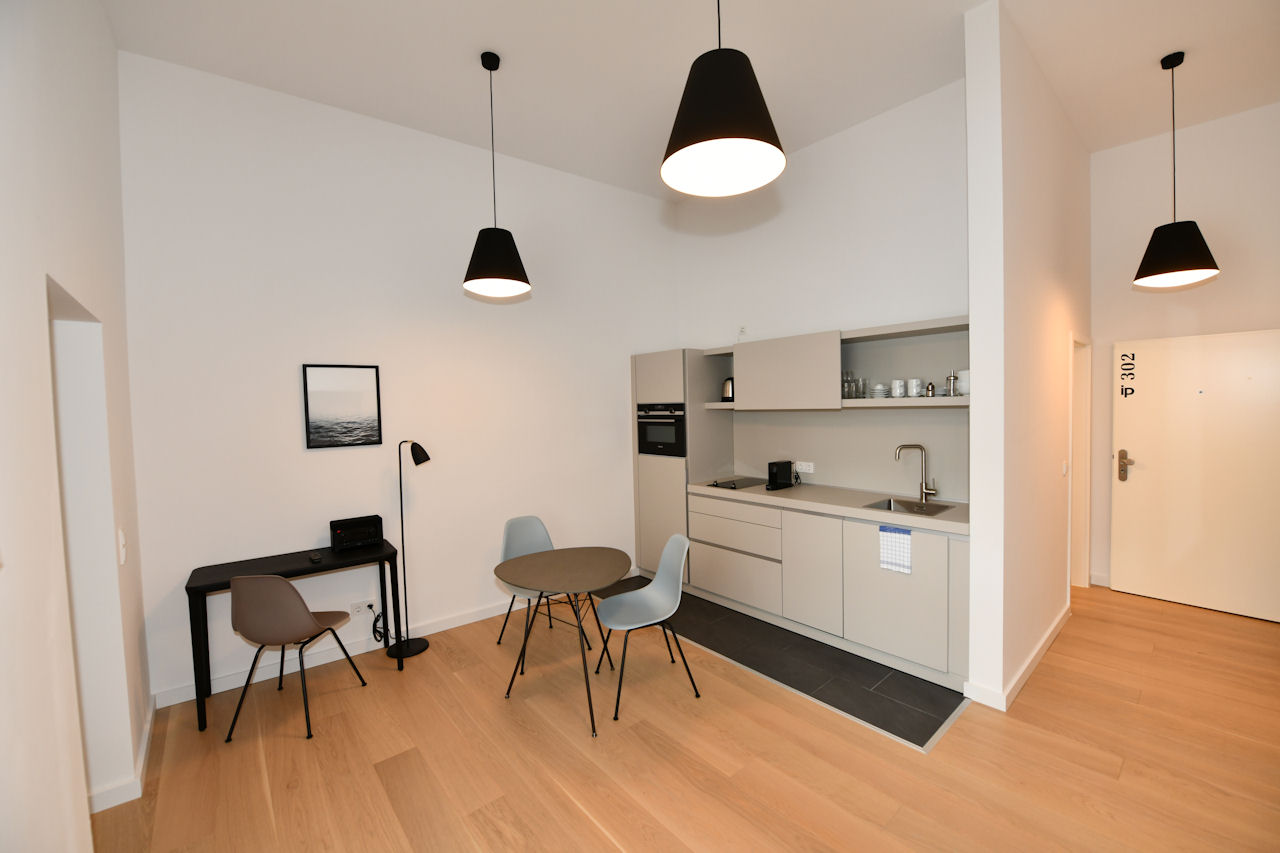 modern furniture, parquet floor, integrated Bulthaup kitchenette with dish washer, microwave and coffeemaker, daylight bathroom with shower, cable-tv, Wifi internet access, high-quality sound system, safe, basement storage unit for sole use of the tenant, coin-operated washing machine and dryer in the basement