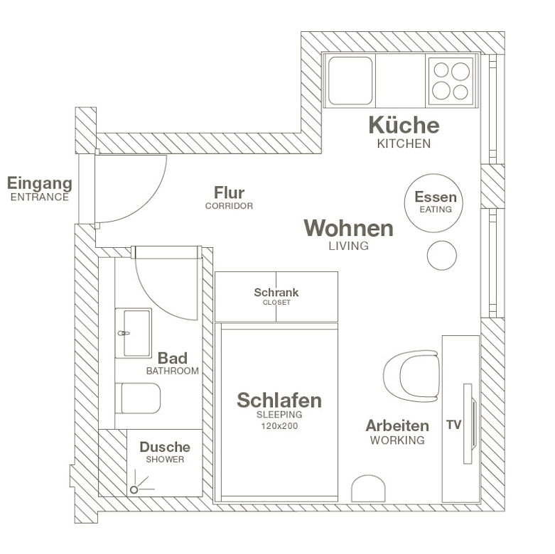 living room / bedroom with single bed 1.20 m, incl. Wifi internet Access,Bed linen and towels not provided, cleaning service by arrangement against surcharge, pets not allowed, non-smoking, max. 1 person, minimum term of lease 6 months