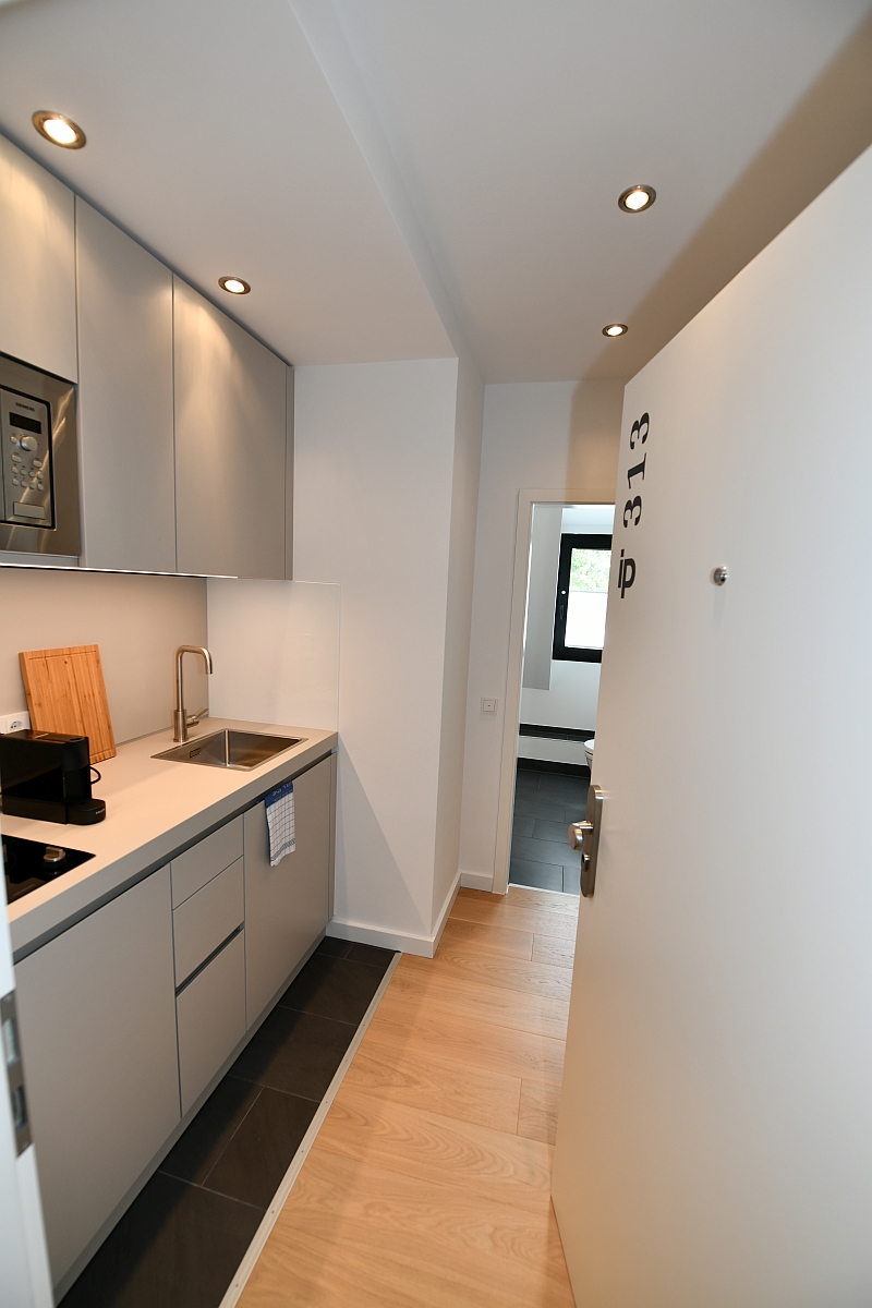 modern furniture, parquet floor, integrated Bulthaup kitchenette with microwave and coffeemaker, daylight bathroom with shower, cable-tv, Wifi internet access, high-quality sound system, safe, basement storage unit for sole use of the tenant, coin-operated washing machine and dryer in the basement