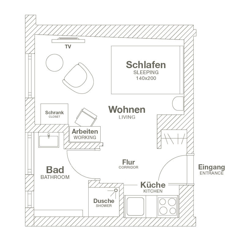 living room / bedroom with queen-sized bed 1.40 m, incl.Wifi internet access, Bed linen and towels not provided, cleaning service by arrangement against surcharge, pets not allowed, non-smoking, max. 2 people, 2nd person against surcharge, minimum term of lease 6 months