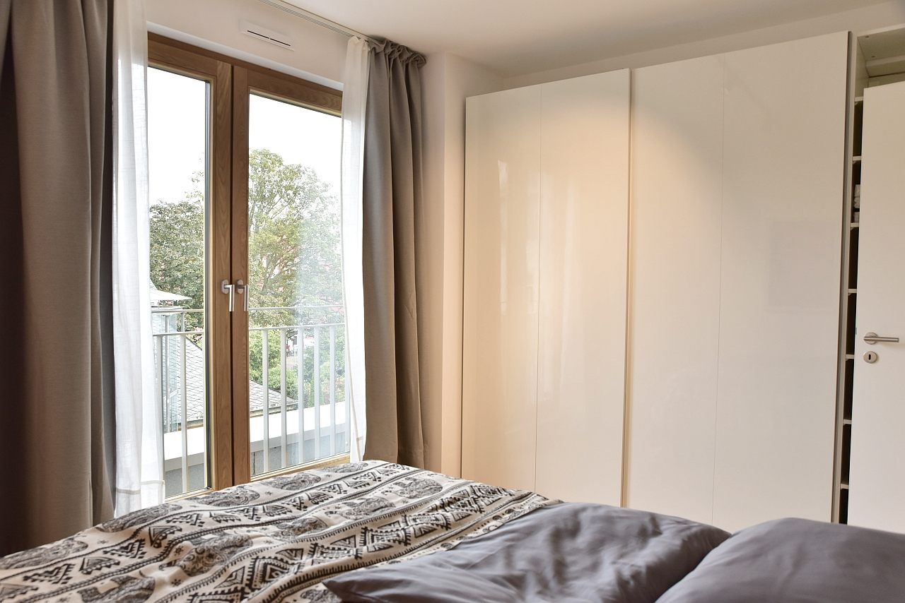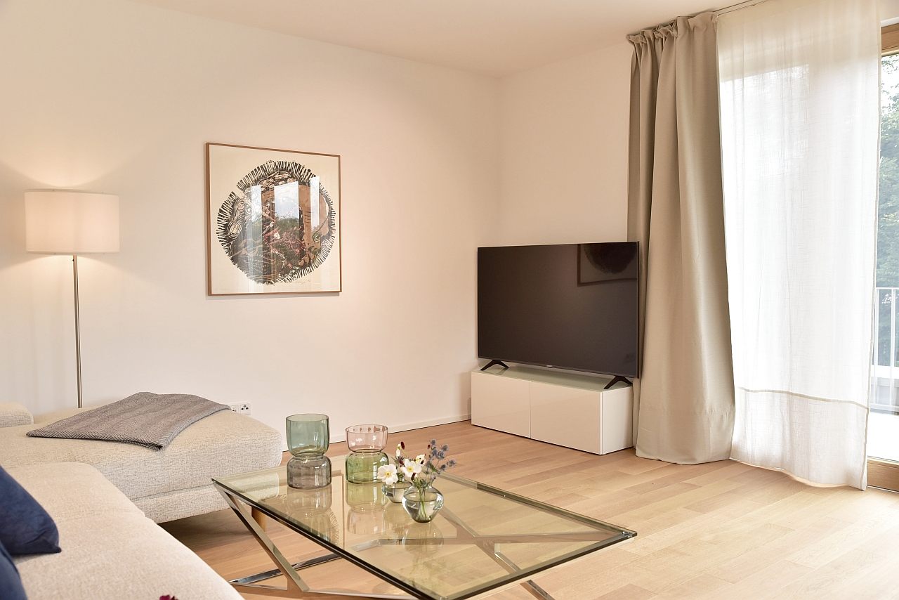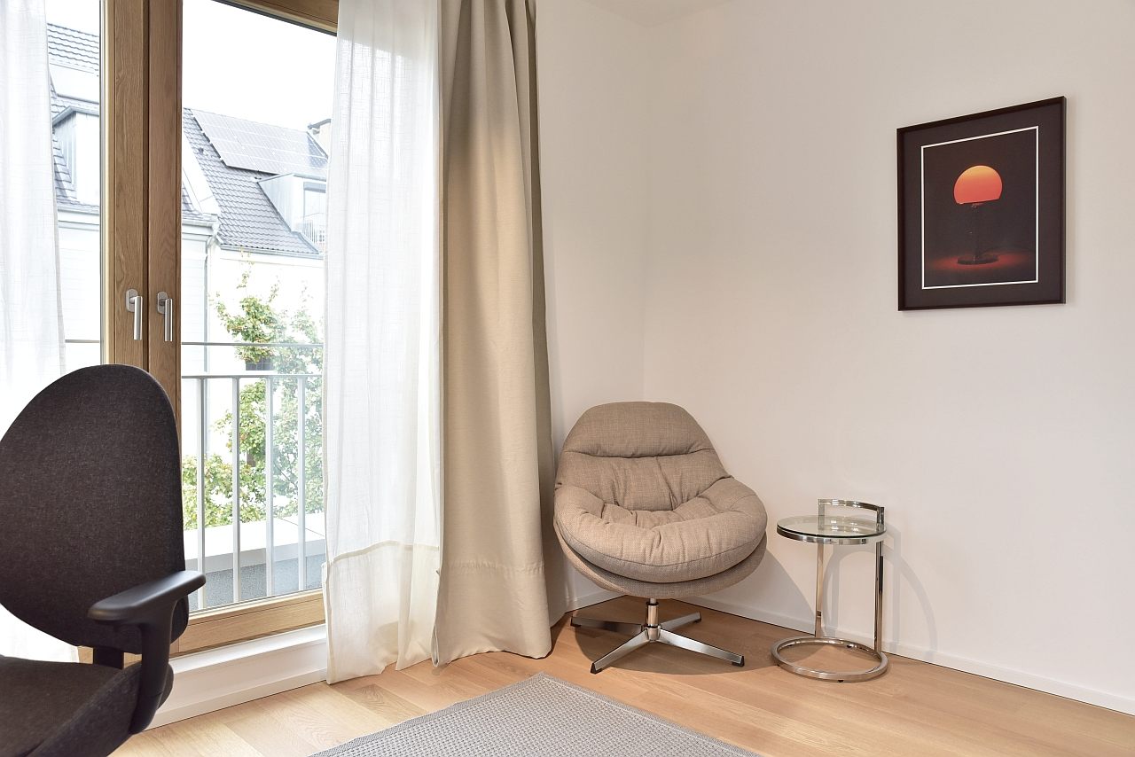 Terrace, living room, study, bedroom with double bed 1,80m, bed linen and towels available. Bed 1.80m, bed linen and towels available, incl. WIFI internet access, pets not allowed, parking space for an extra charge, charging station for an extra charge, non-smoking, max. 2 persons, minimum rental period 6 months
