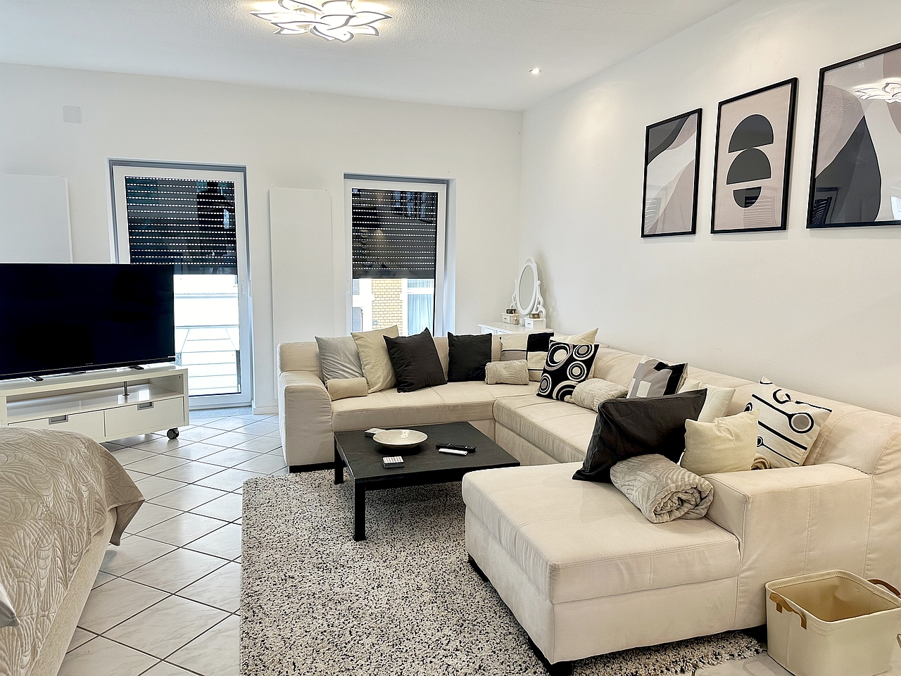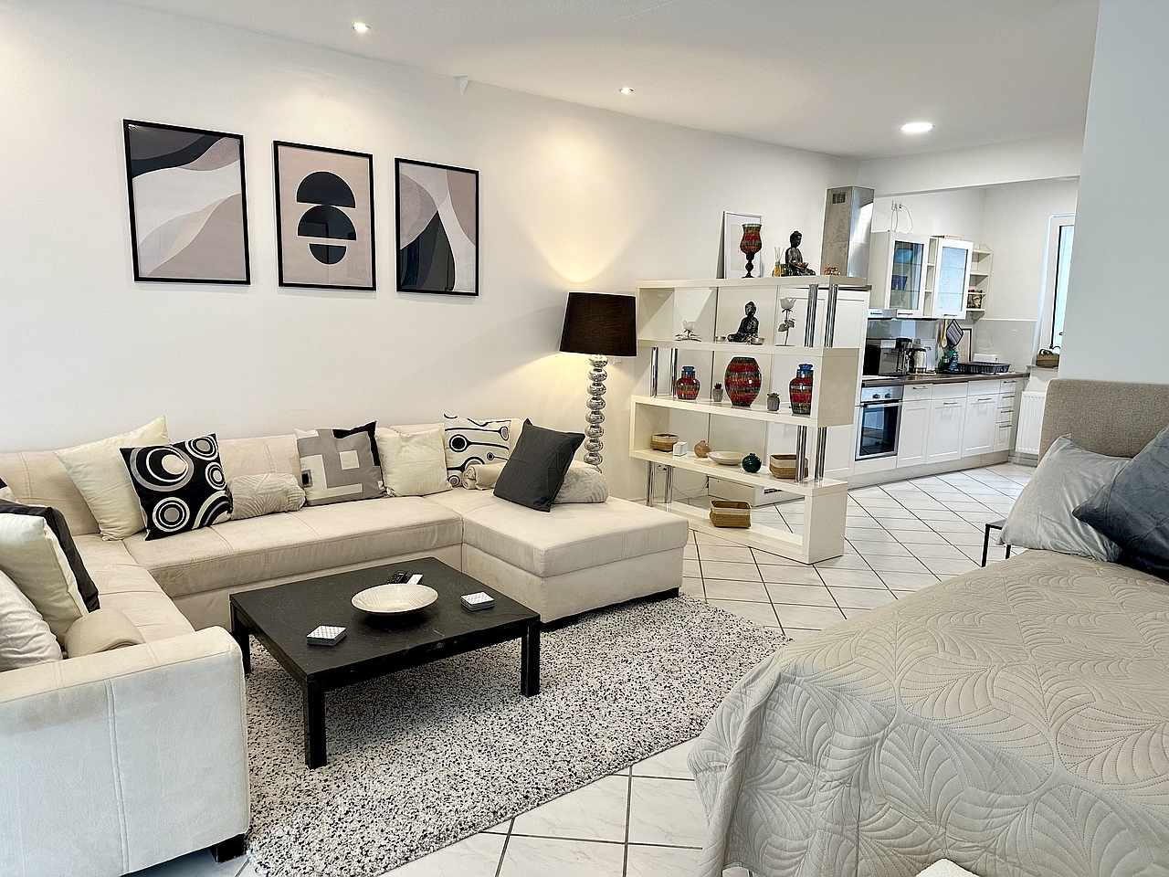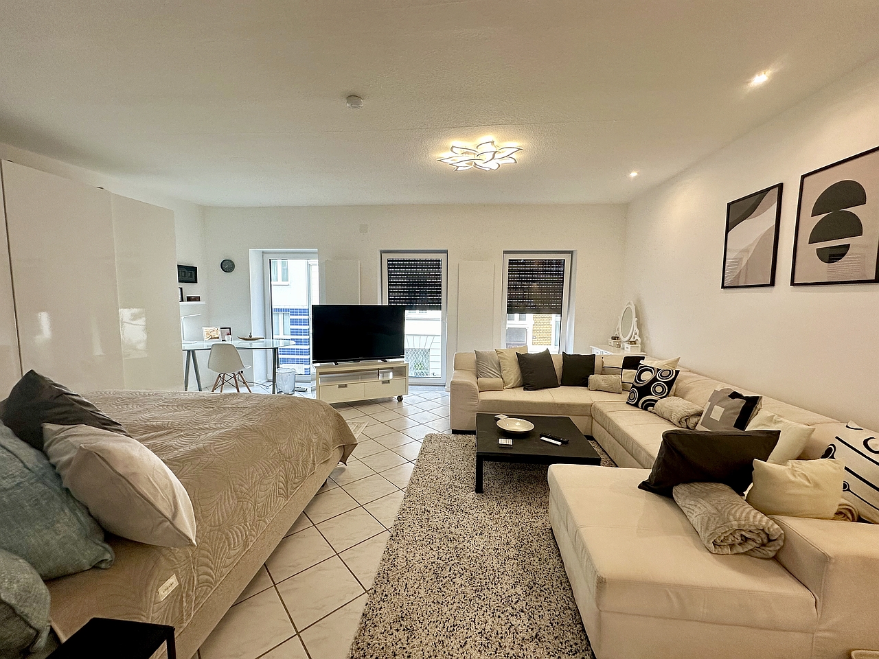 Balcony, living room with separated Bed area with double bed 1,80m, bed linen and towels available, incl. Wi-Fi internet access, pets not allowed, non-smoking, max. 2 persons, rental price is for two persons, minimum rental period 6 months.
