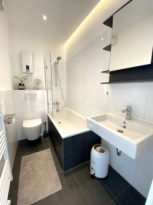 moderne und hochwertige Möblierung, Holzdielen, separate Einbauküche mit Iduktionsherd, Mikrowelle, Kaffeevollautomat und Spülmaschine, Wannenbad, WLAN-Internetanschluss mit 250 Mbit, Abstellkammer auf dem Flur, eigener Kellerraum, Waschmaschine und Trockner im Waschkeller,