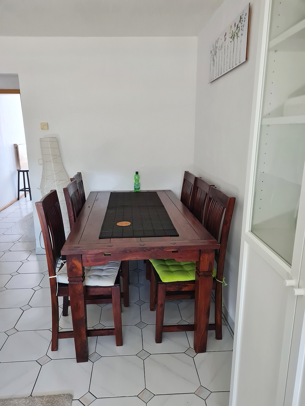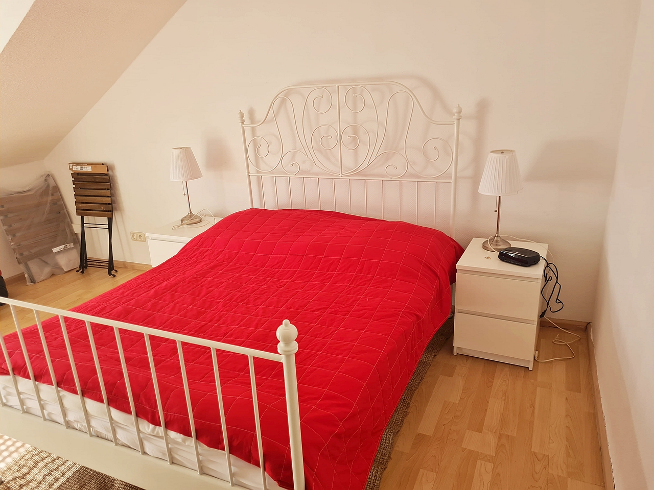 Wohnzimmer mit Schlafsofa, Schlafzimmer mit Doppelbett 1,40 × 2,00 m, separates Zimmer mit Einzelbett 0,60 m × 2,00 m. Balkon, Gartenzugang, Autostellplatz im Innenhof. Bettwäsche und Handtücher vorhanden. Nichtraucher, Tierhaltung nicht gestattet, nicht kindgerecht, max. 3 Person, Mindestmietdauer 3 Monate. Miete inkl. Nebenkosten: 1150 pro Monat, inkl. Strom, inkl. Heizung, plus 100 Euro Endreinigung.