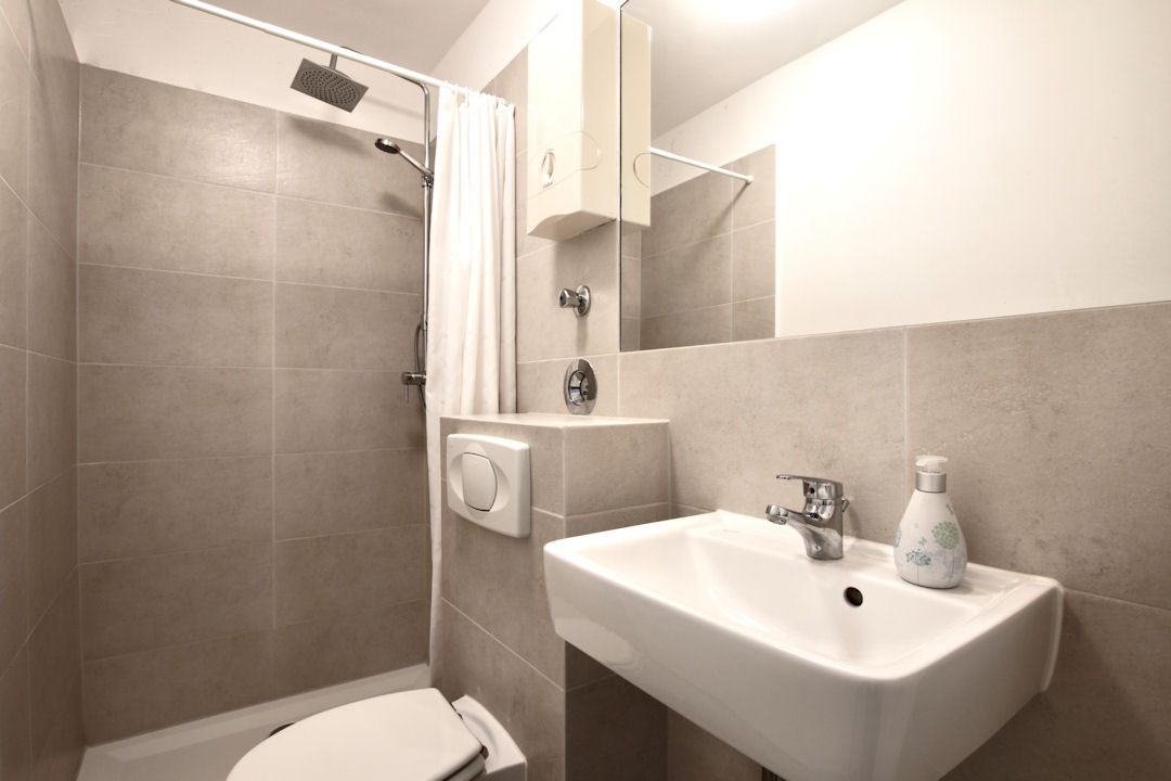 moderne Möblierung, Fliesenboden, integrierte Singleküche mit Herd, Badezimmer mit Dusche, Flatscreen, Kabel-TV, WLAN-Internetanschluss