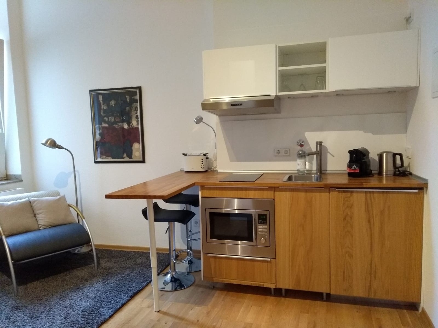moderne und hochwertige Möblierung, Parkettboden, integrierte Singleküche, Tageslicht Duschbad, Kabel-TV, WLAN- Internetanschluss inklusive, Münzwaschmaschine und Trockner im Keller