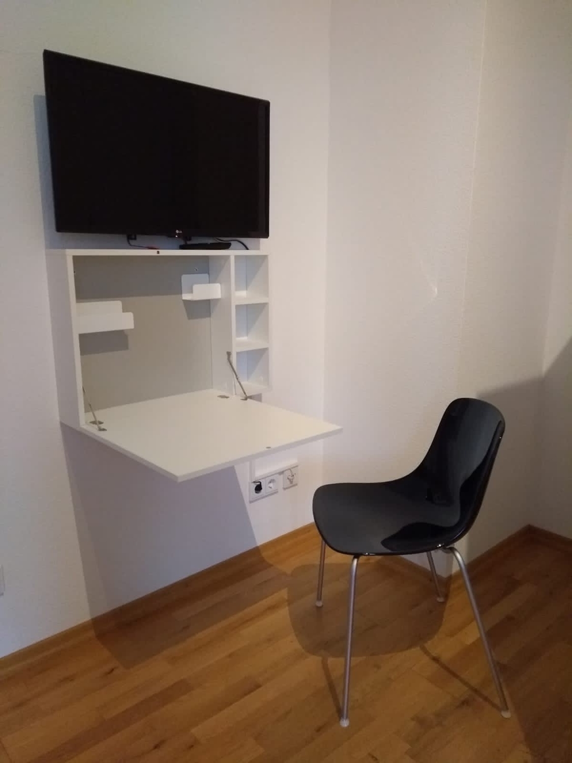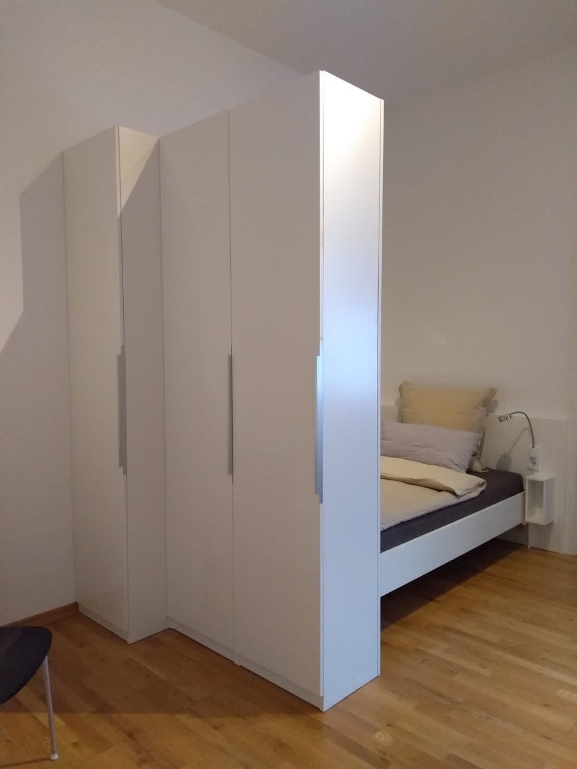 Dachterrasse zur Gemeinschaftsnutzung, Wohn-/ Schlafzimmer mit französischem Bett 1,40 m, Bettwäsche und Handtücher vorhanden, Tierhaltung nicht gestattet, Nichtraucher, inkl. 14-tägigem Reinigungsservice, max. 1 Person, Mindestmietdauer 3 Monate
