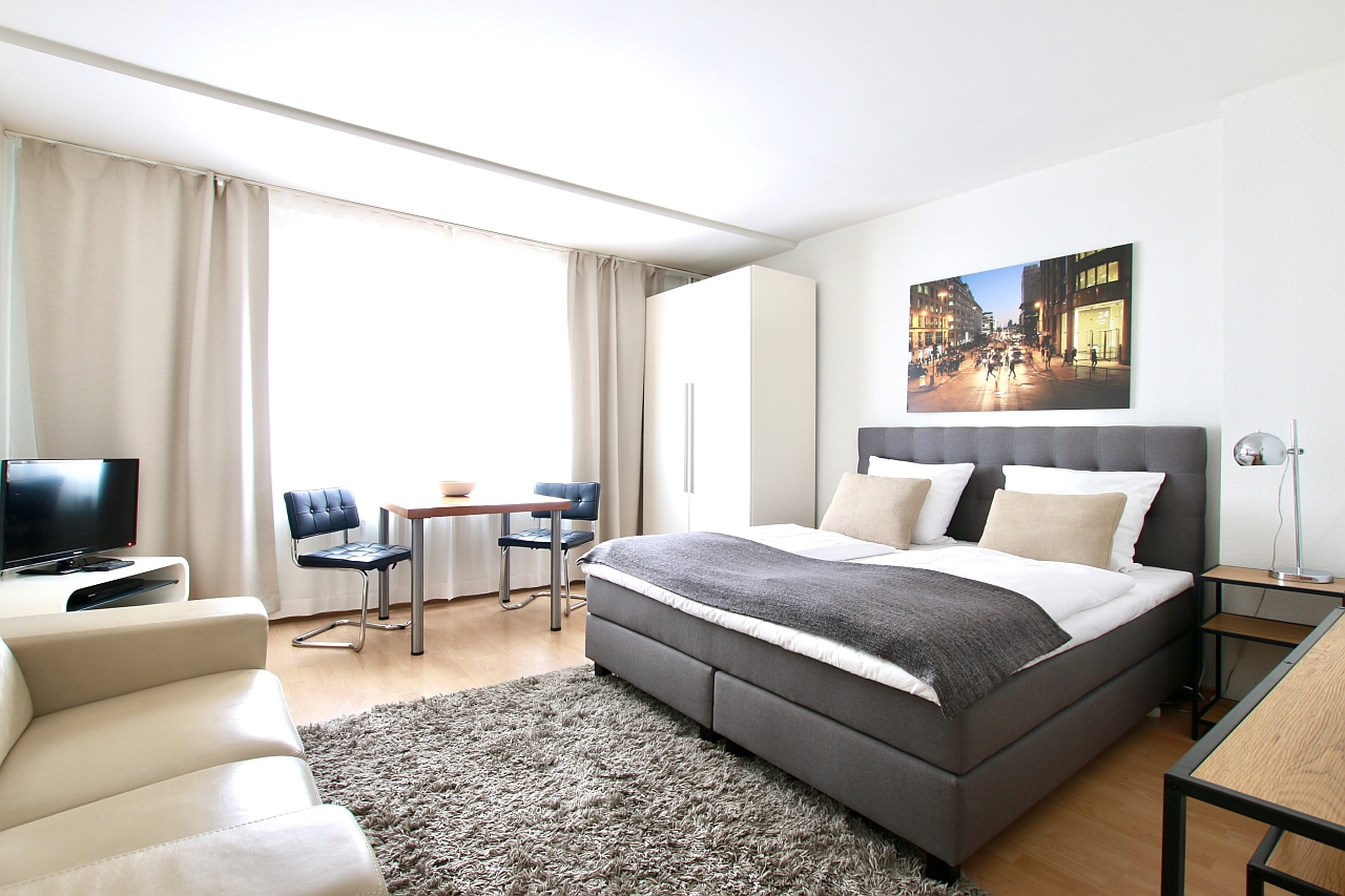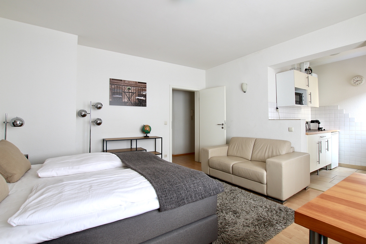 Wohn/Schlafraum mit Boxspringbett 1,80m, Bettwäsche und Handtücher inkl., Reinigungsservice auf Anfrage (gegen Aufpreis) möglich, WLAN-Internetanschluss inkl., Mindestmietdauer 2 Monate,