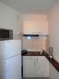 zeitlose Möblierung, Laminatboden, integrierte Singleküche mit Mikrowelle, Duschbad, Kabel-TV, WLAN-Internetanschluss, Waschmaschine und Gemeinschaftstrockner im Haus