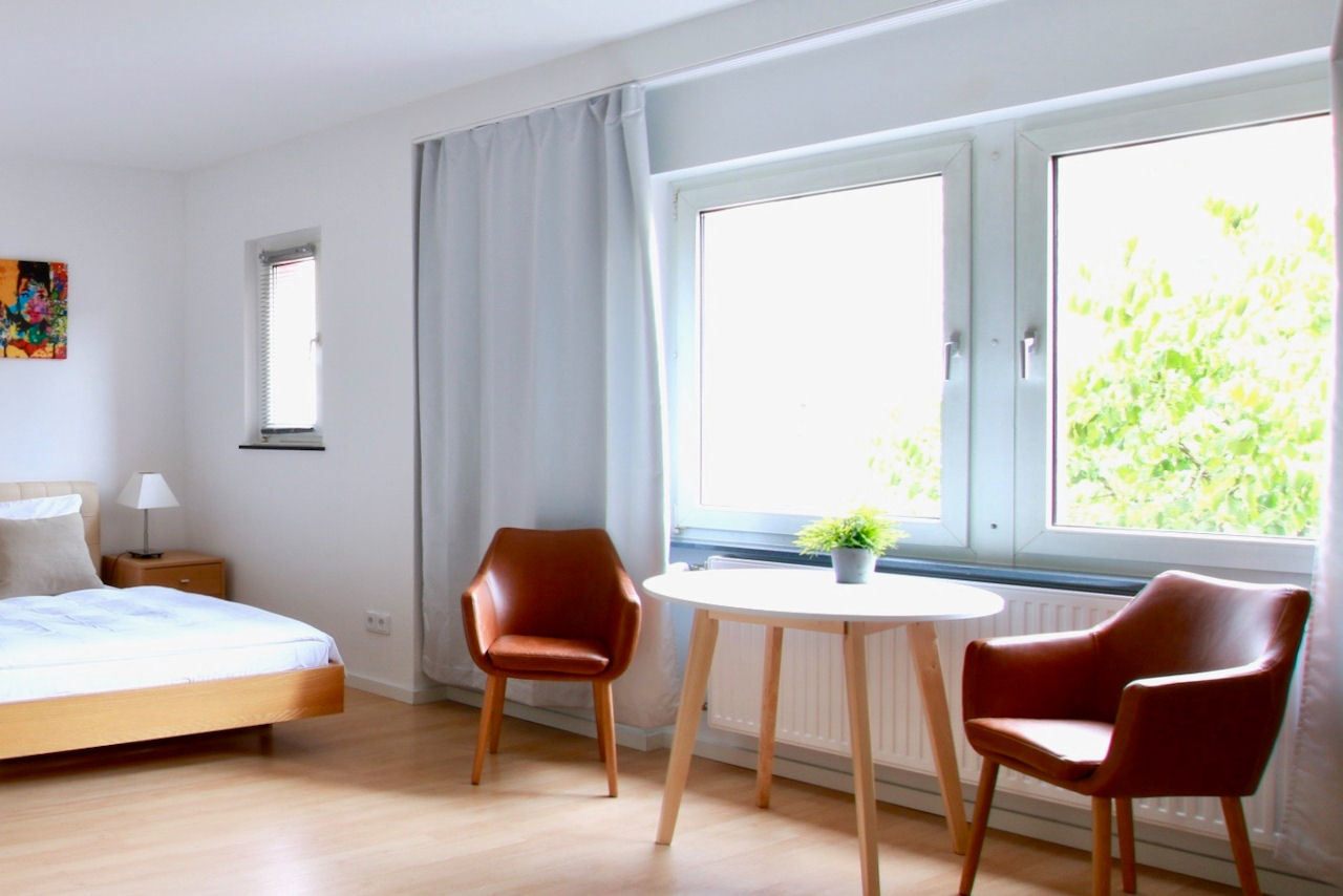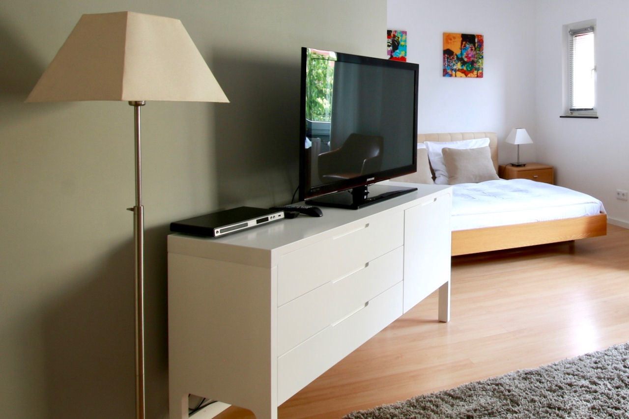 Wohn/ Schlafzimmer mit Doppelbett 1,60m, Bettwäsche- und Reinigungsservice auf Anfrage (gegen Aufpreis) möglich, inkl. kostenlosem WLAN-Internetanschluss, Mindestmietdauer 2 Monate, Kürzere Mietdauer auf Anfrage
