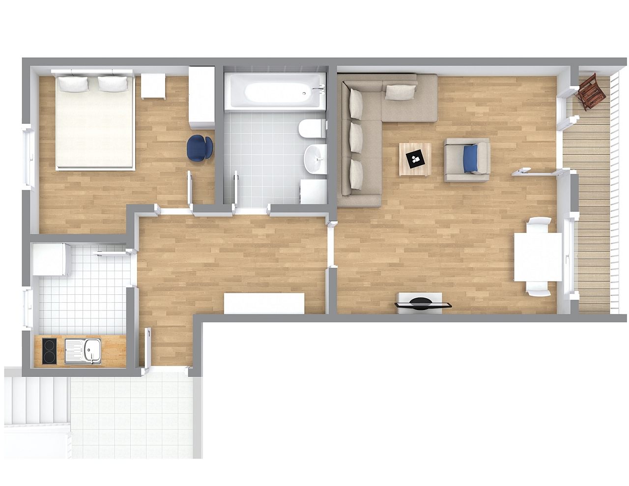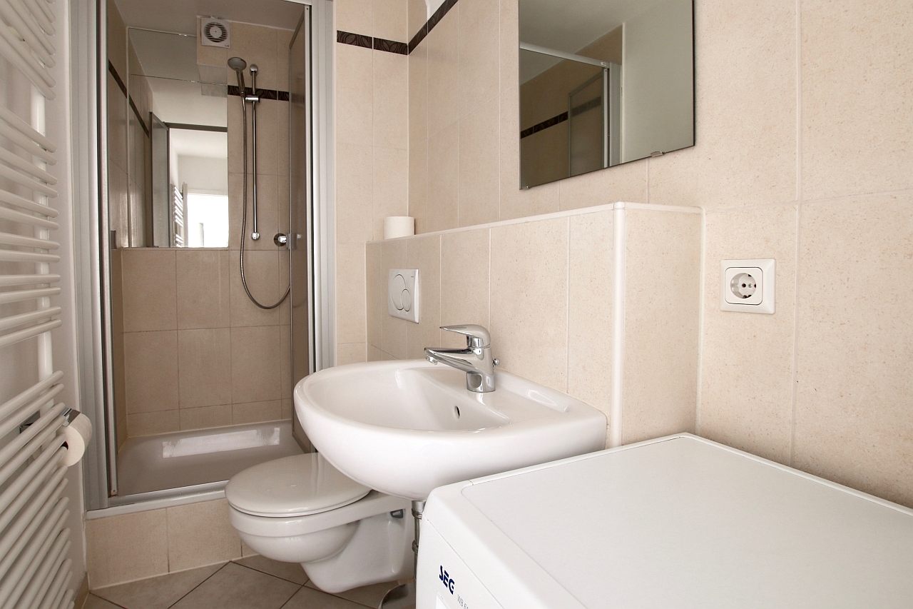 Moderne Möblierung, Laminatboden, kleine separate Einbauküche mit Spülmaschine und Mikrowelle, Duschbad mit Waschmaschine, Kabel-TV Flatscreen, WLAN-Internetanschluss