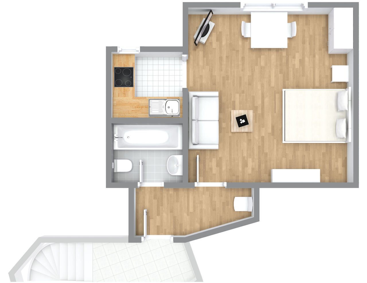 Moderne und freundliche Möblierung, Parkettboden, separate kleine Einbauküche mit Mikrowelle, Duschbad, Kabel-TV mit Flatscreen, DVD, WLAN-Internetanschluss