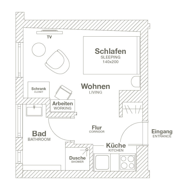 Wohn-/ Schlafraum mit franz. Bett 1,40m, inkl. W-Lan Internetanschluss, Bettwäsche und Handtücher nicht vorhanden, Reinigungsservice nach Absprache gegen Aufpreis, Tierhaltung nicht gestattet, Nichtraucher, max. 2 Person, 2. Person gegen Aufpreis, Mindestmietdauer 6 Monate